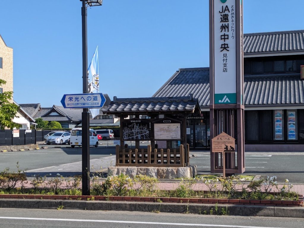 坂を下りて「旧東海道」に戻る。右手に「元町珈琲 磐田見付の離れ」という看板がある。ここでコーヒーを飲もうと思ったが、まだオープンしていない。無念の思いで通り過ぎる。「JA 遠州中央見付支店」の前の標識を見てビックリ! なんと「旧東海道」が「栄光への道」に昇格しているではないか! この名前は東京五輪卓球混合ダブルスで金メダルを獲得したこの地区出身の「水谷隼」さんと「伊藤美誠」選手の功績をたたえようと名付けられたものらしい。