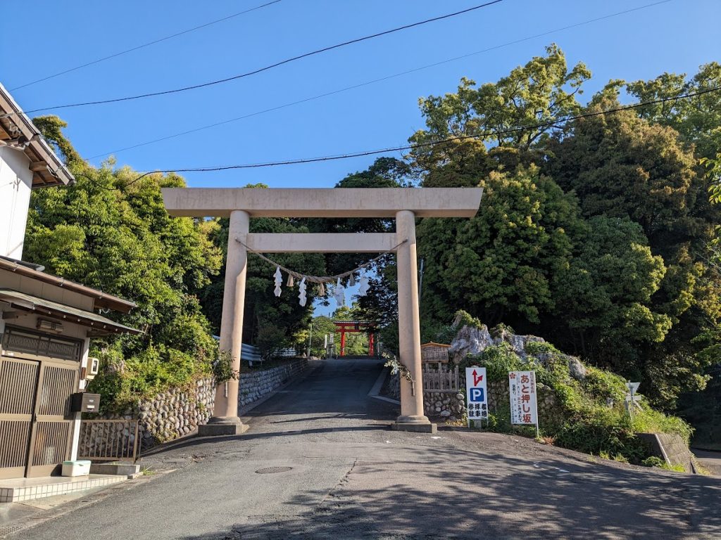 「東木戸跡」から進むと、すぐ右に入る道があり、そこに「縣社 矢奈比賣(やなひめ)神社」の石柱があった。ここが「見附天神」への登り口である。「磐田原台地」の南端に位置しており、北へ進む道は上り坂となる。急な坂道を上っていくと、コンクリート製の鳥居が現れ、隣に「あと押し坂」の看板が。もう一息。坂の上に赤い鳥居が見えた。