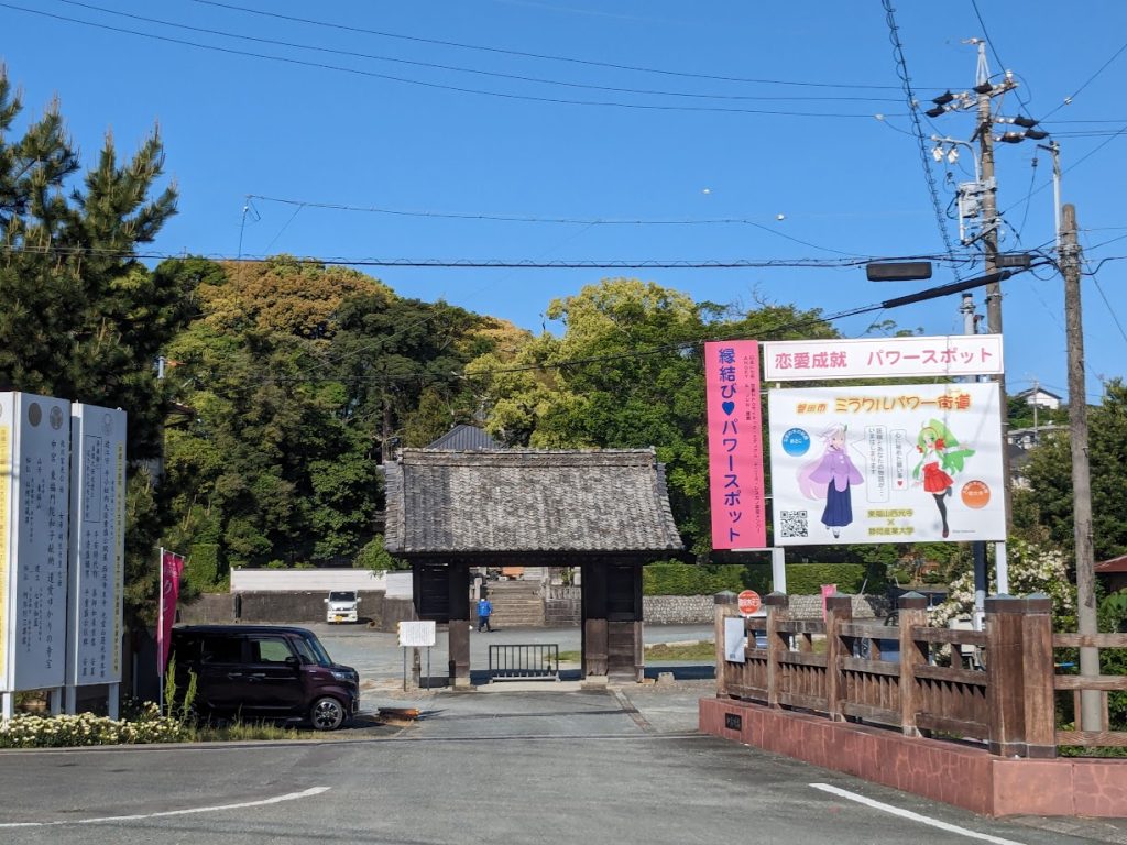 中央に見えるのが「西光寺」の表門だが、その隣にピンク色の「縁結び♥パワースポット」の看板が。建物とはかなり不釣り合いだが、早朝にもかかわらず、結構、人が来ている様子だった。ここは「時宗」の寺院だが、境内を覆う大クスとナギの木が恋愛成就と縁結びのパワーを持つとテレビ・ラジオで紹介されているようだ。宣伝効果抜群で、参拝者が絶えないらしい。