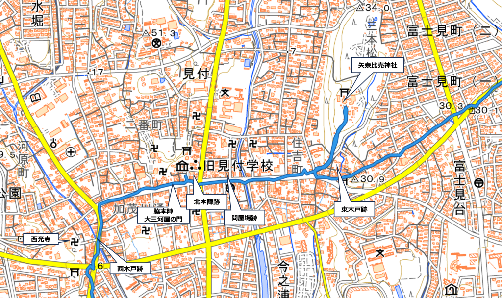 「見付宿」の概要はつぎの通り。図 2 に古地図、図 3 に現在の地図を示す。