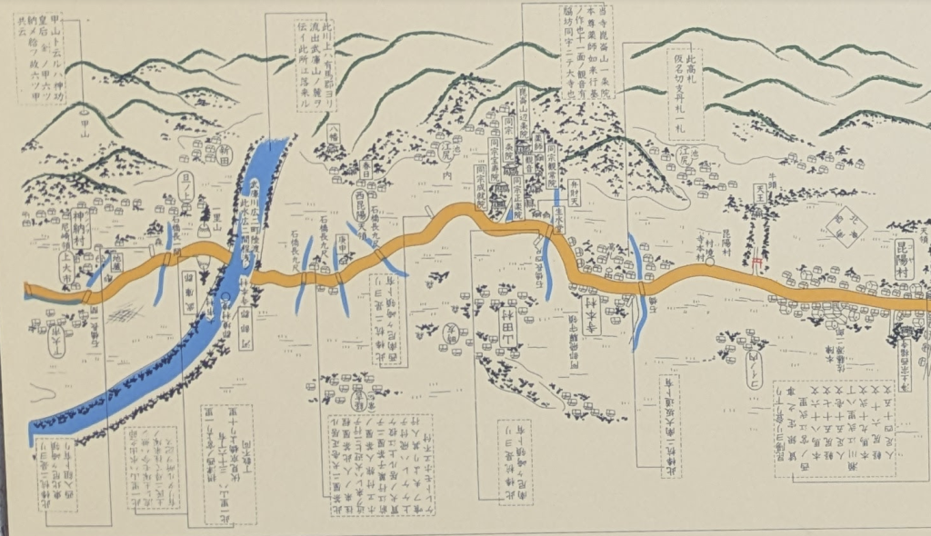 この先の右側が「大鹿交流センター」で、その前に「行程記」を元に描かれた西国街道の地図があった。この「行程記」というのは、毛利藩絵師「有馬基惣太」が参勤交代の藩主のために描いた全 23 帖をさす。「萩往還」「山陽道(西国街道)」「東海道」「中山道」を描いている。ここに掲載されているのは、「山陽道(西国街道)」のうちの「下河原」から「西昆陽」まで。三分割してここに載せておこう。