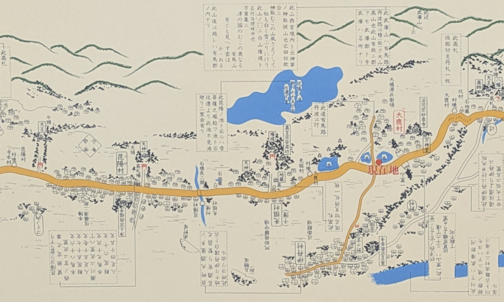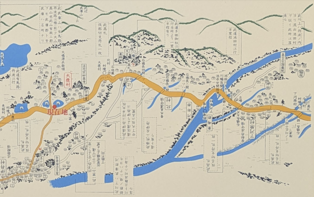 図 2-1 のように「大阪府」と「兵庫県」の境にある「下河原」から「猪名川」を越え、少し土手沿いに歩いた後、西行して「大鹿村」までやってきた。「猪名川(図ではイナ川)」は「陸渡り」とあるから水の少ないところ歩いたものと思われる。現在の「大鹿交流センター」のある場所(赤丸)は昔は池、前の南北の道が「有馬路(現在の有馬街道)」だ。