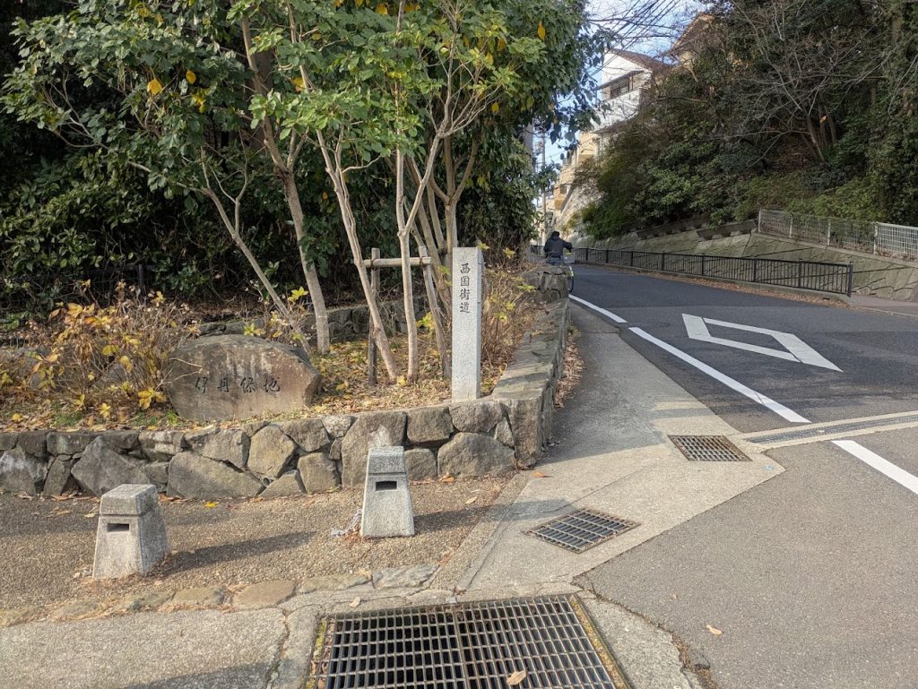 土手から離れて西に進む。南北に走る「尼崎池田線」を越えると、「西国街道」の道標があり、そこから坂が始まる。これが「伊丹坂」。