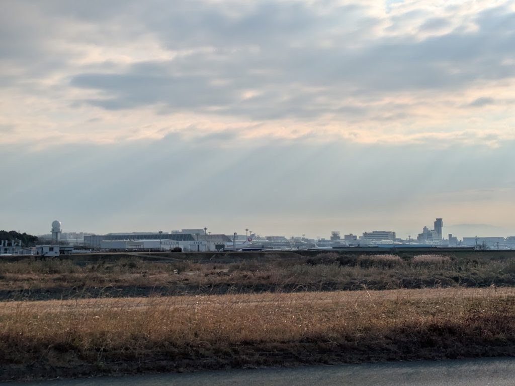 橋から下り、土手道を南下する。川向こうに空港がよく見えた。