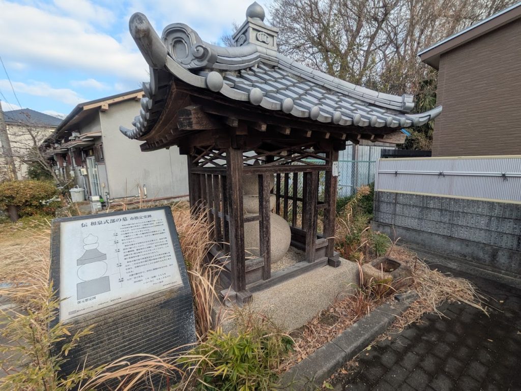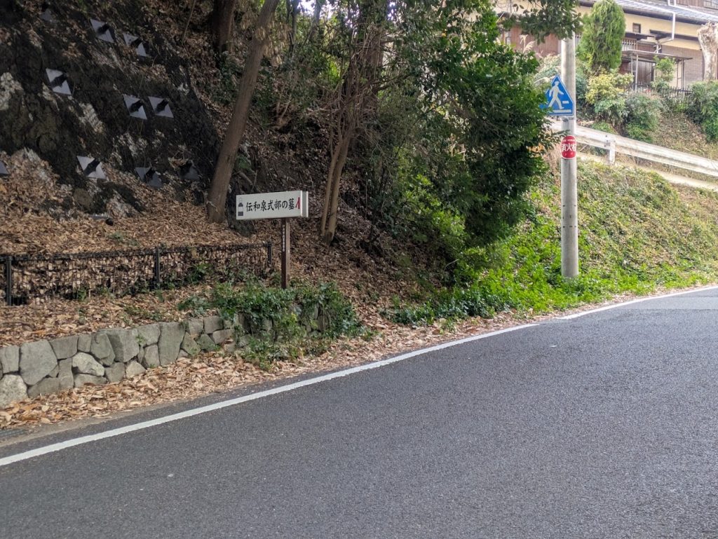 矢印に従い急な坂道を上っていくと、本来は正面右に墓があったのだろうが、住宅が建っていて大回りしなければいけない。あったのは写真の「五輪塔」である。鎌倉時代後期の造立と考えられるらしい。つまり、平安時代の「和泉式部」とは合わない。「伝」とあるのがくせものなのだ。説明板には「和泉式部は平安時代の有名な歌人で、和泉守橘道貞に嫁いだことから、この名がつけられた。道貞と離別後、藤原保昌と再婚し、保昌が摂津国河辺郡平井(現宝塚市)の人であったことから、この地に供養塔が建てられたのであろう」としている。大河ドラマ「光る君へ」では「泉里香」さんが演じていた恋多き女「和泉式部」、彼女が詠んだ歌にこの先の「昆陽(こや)」が入っているものがある。