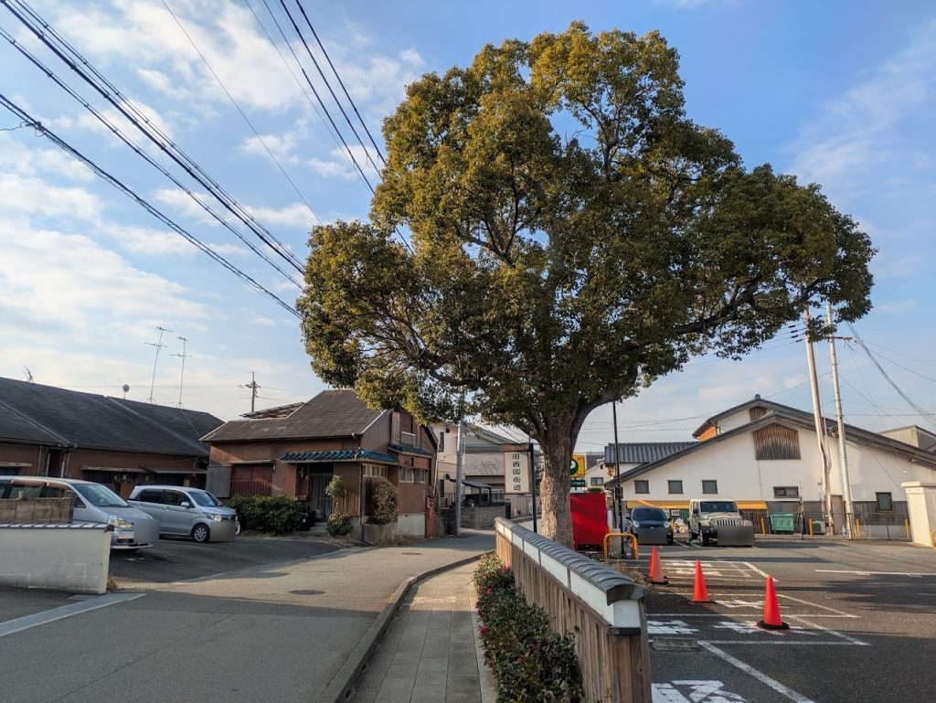 「大鹿」に入り、右側に立派なクスノキ。地名の由来は、大同二年(807)に「坂上田村麻呂」がこの森の中で大鹿を射止めたことによるとされているらしい。