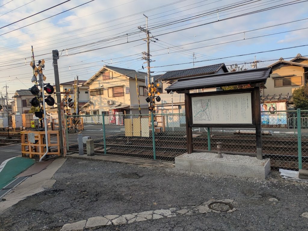 「阪大坂下」の交差点を直進(南下)する。道は次第に西向きとなり、「阪急宝塚線」の線路の前に出る。と、そこに説明板があった。
