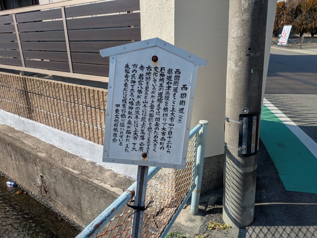 「稲野小学校」の前に「西国街道」の標柱と説明板と「札の辻」から移設された道標があった。「すぐ 西之宮」「すぐ 京都」「すぐ 中山・小濱(こはま)」「すぐ 尼ヶ崎・大坂」と刻まれている。「すぐ」は「まっすぐに進むと」の意味である。