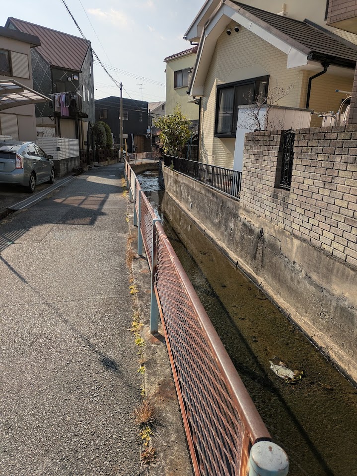「段上町」に入り、南下して新幹線の高架をくぐり「上大市」に出た。そこに「案内板」。ここから用水沿いに細い道を進む。これは「百間樋」と呼ばれる灌漑用水だろう。
