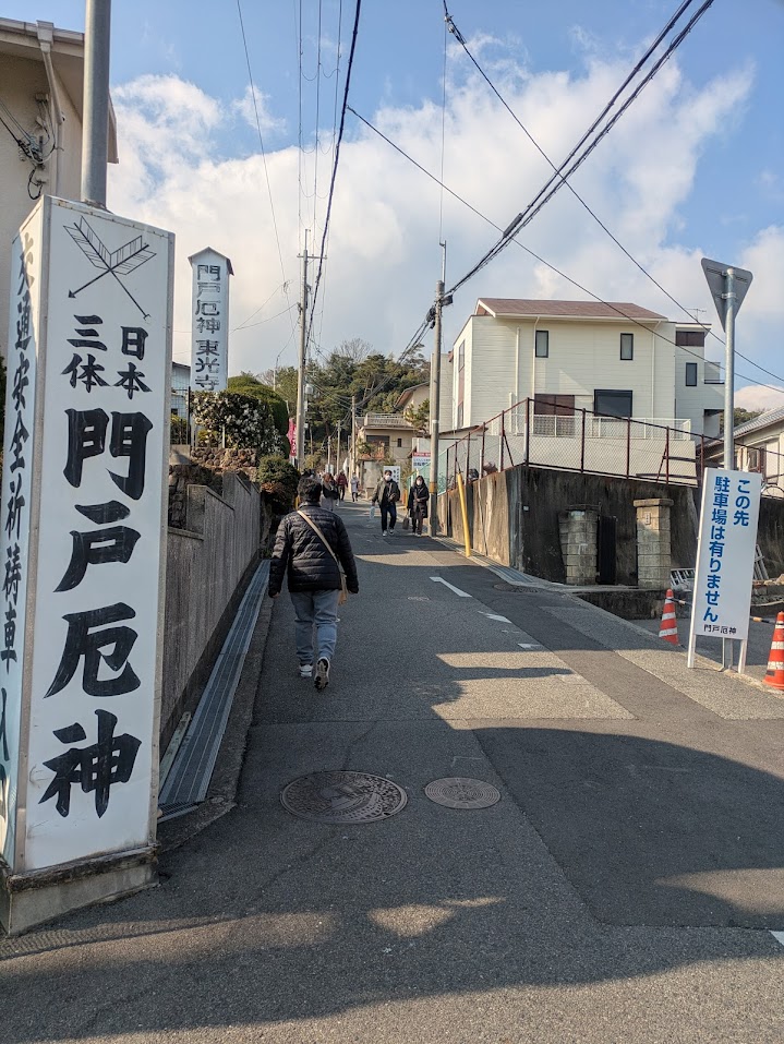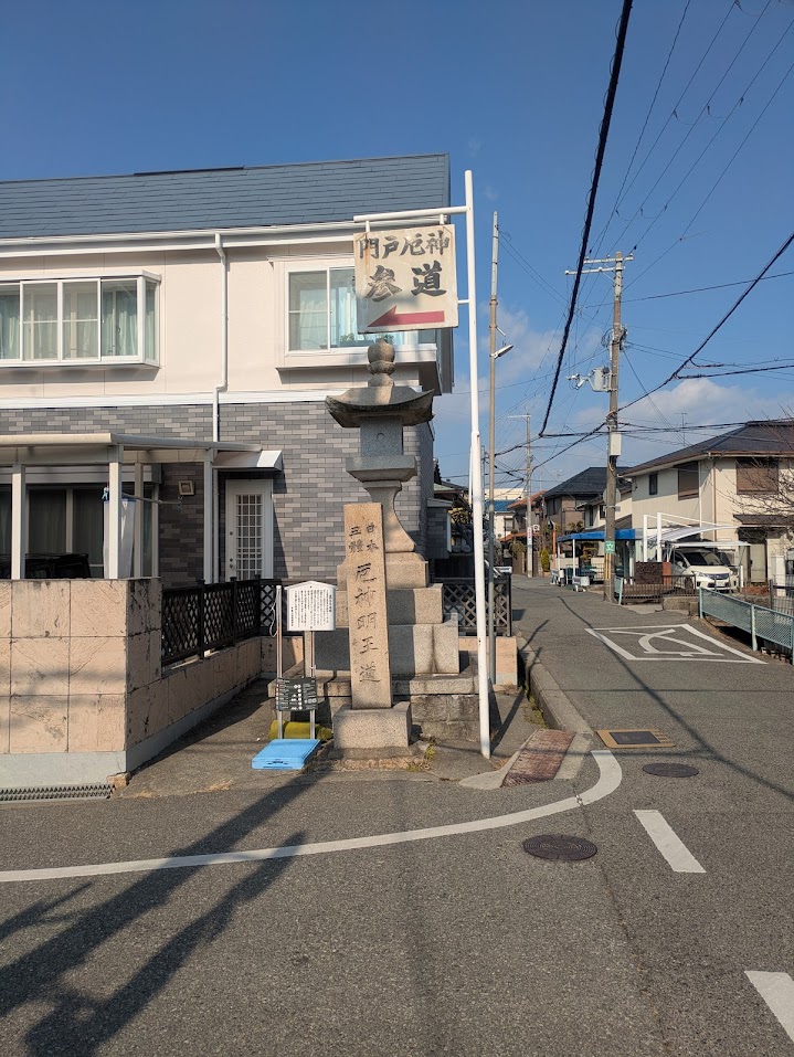 矢印に従い左折して進むと、「門戸厄神」の標柱と坂道が現れる。