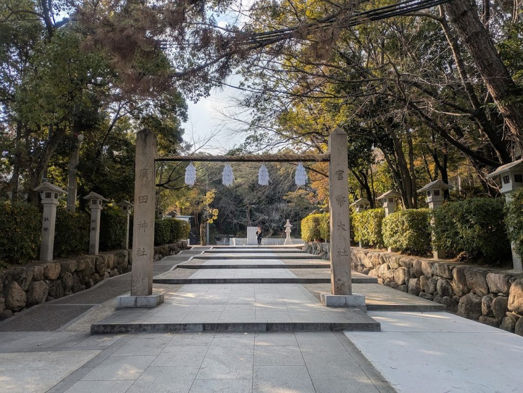 説明板を読むと、「明治七年には境内地を分割譲与し末社の戎宮総本社・西宮神社を独立させています」とある。なんと、今日、最後に行く予定の「西宮神社」は「廣田神社」の末社だったのだ。さらに、「『伊勢大神宮御同体』の兵庫県下第一の御社格御由緒の大社として広く崇敬を集め、中世には『西宮参拝』と称して国家の神事を司った神官の歴代長官や公家・五山の僧侶たちが度々に互って参詣し、物語や和歌・今様・漢詩に多々その跡を残しています」とあり、「西宮」という地名がこの神社から来ていることがわかる。