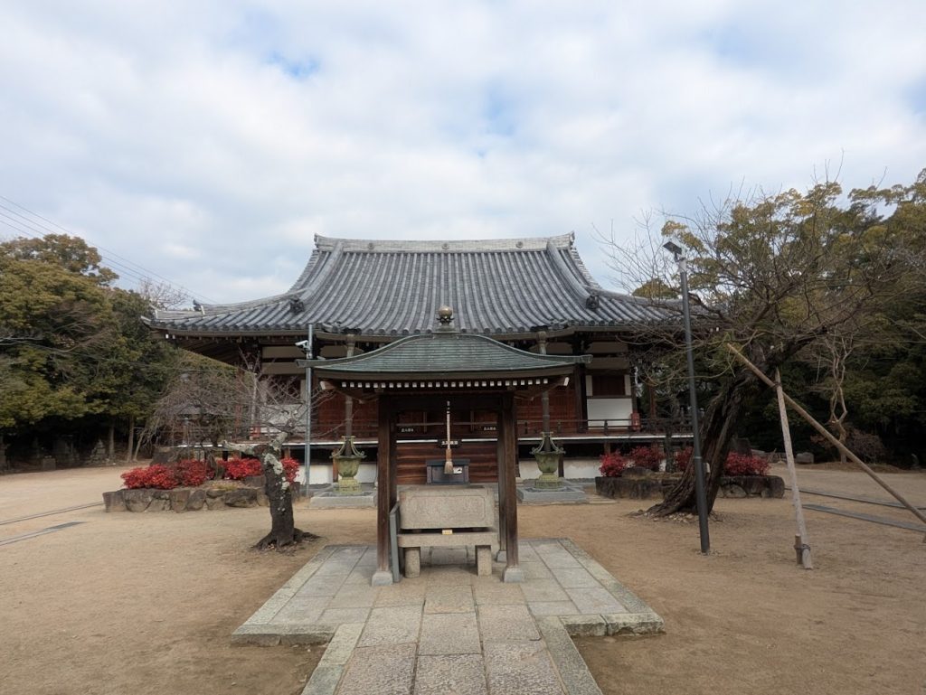 丹塗りの「山門」は江戸時代中期に再建されたもので、昭和 44 年(1969)に兵庫県の指定文化財(有形文化財)に指定された。ここを潜ると正面に本堂。左手に行基堂。右手前に鐘堂。