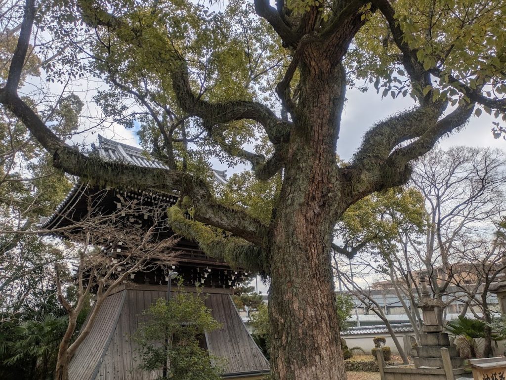 『今昔物語集』巻第二十九第十七に「攝津国小屋寺に来て鐘を盗みし語」というのがある。先の説明板でも簡単に触れられていたが、窃盗団が大がかりな技で「昆陽寺」の鐘を盗んだという話。原文現代語訳が公開されている。鐘堂の横の木、枝から草がたくさん生えていて、かなりの年代ものだ。