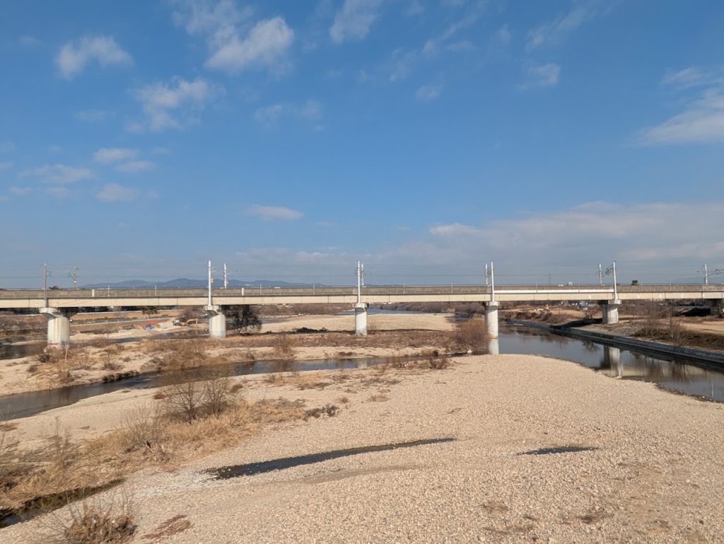 つぎの川は「猪名川」。大きな川で「軍行橋」が架かっている。この名前は、明治 44 年(1911)にここで陸軍の演習が行われ、そのために架けられた橋であることから名付けられたそうだ。