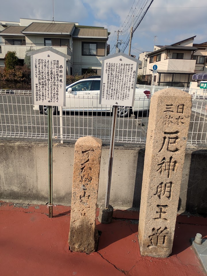 「下大市」に入り、「甲山観音と門戸厄神の道標」。説明板を読むと、これらの道標はそれぞれ別の場所にあったものをここにまとめたらしい。
