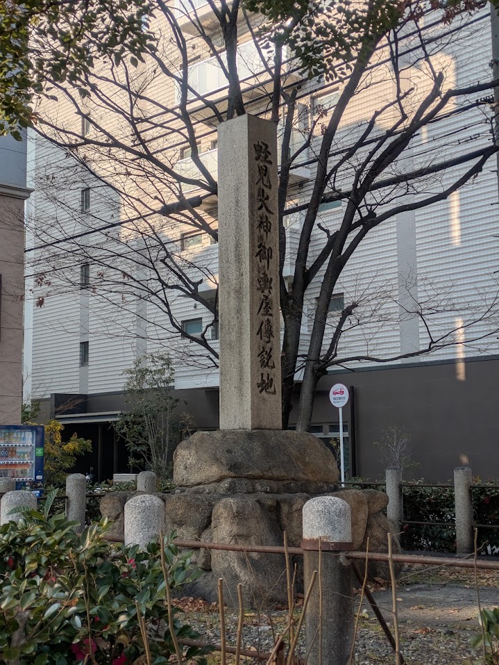 「街道歩き」に戻ろう。「広田神社」から元のところまで戻り、逆方向に街道を歩く。「国道 171 号線」に合流し、二つ目の交差点で左折して、ひたすら南下する。阪急神戸線を潜ったあと右へ、次の通りで左折してまた南下。「国道 2 号線」「阪神電車」も越えて「阪神高速」の一本手前で右折して西に歩いて行くのだが、この道が「旧国道」らしい。「本町」に出たところで、南北の道路を渡るための信号がなく、仕方なく「国道 43 号線」に出て信号のある横断歩道を横断。ちょうどそこが公園になっていて「蛭児(えびす)大神御輿屋傳説地」の碑が立っていた。どこからが「西宮宿」なのかはっきりわからないが、どうもこあたりが宿場の中心で「本陣」、「脇本陣」もこのあたりだという。15:01 「西宮宿」に入った。