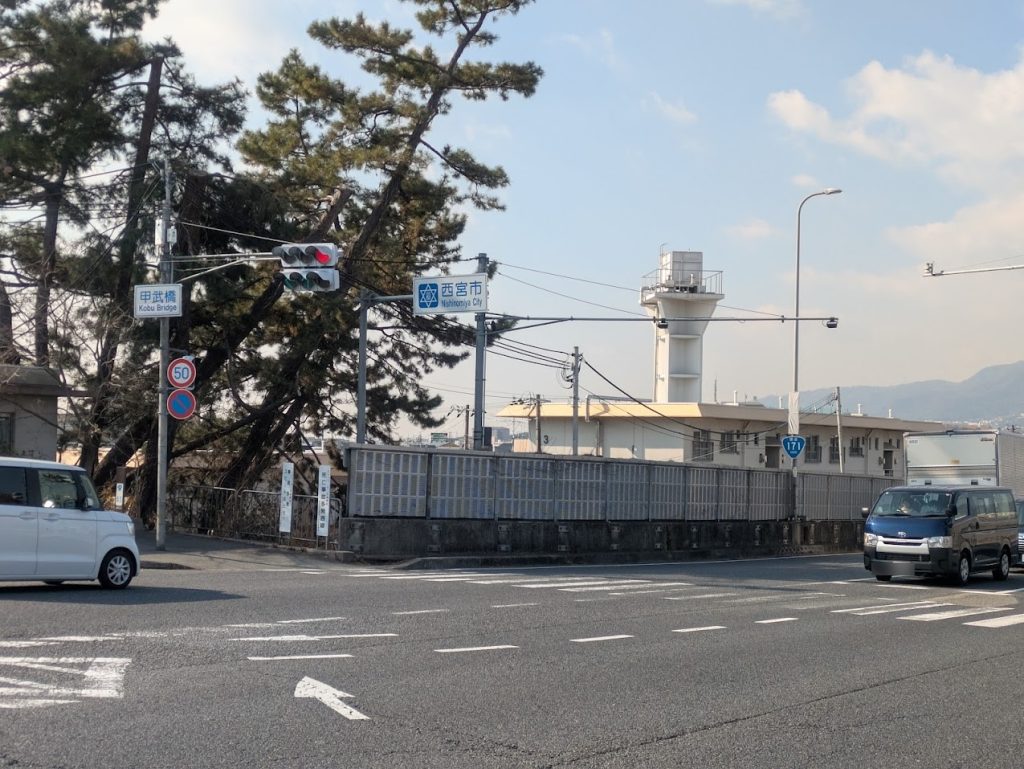 国道は左に曲がるが、街道は直進して「武庫川」に向かう。「常松二丁目北交差点」、前方は「武庫川」でかつては右手に「髭の渡し」があった。現在は渡し場はないので南に進み、「国道 171 号」の「甲武橋」を渡る。