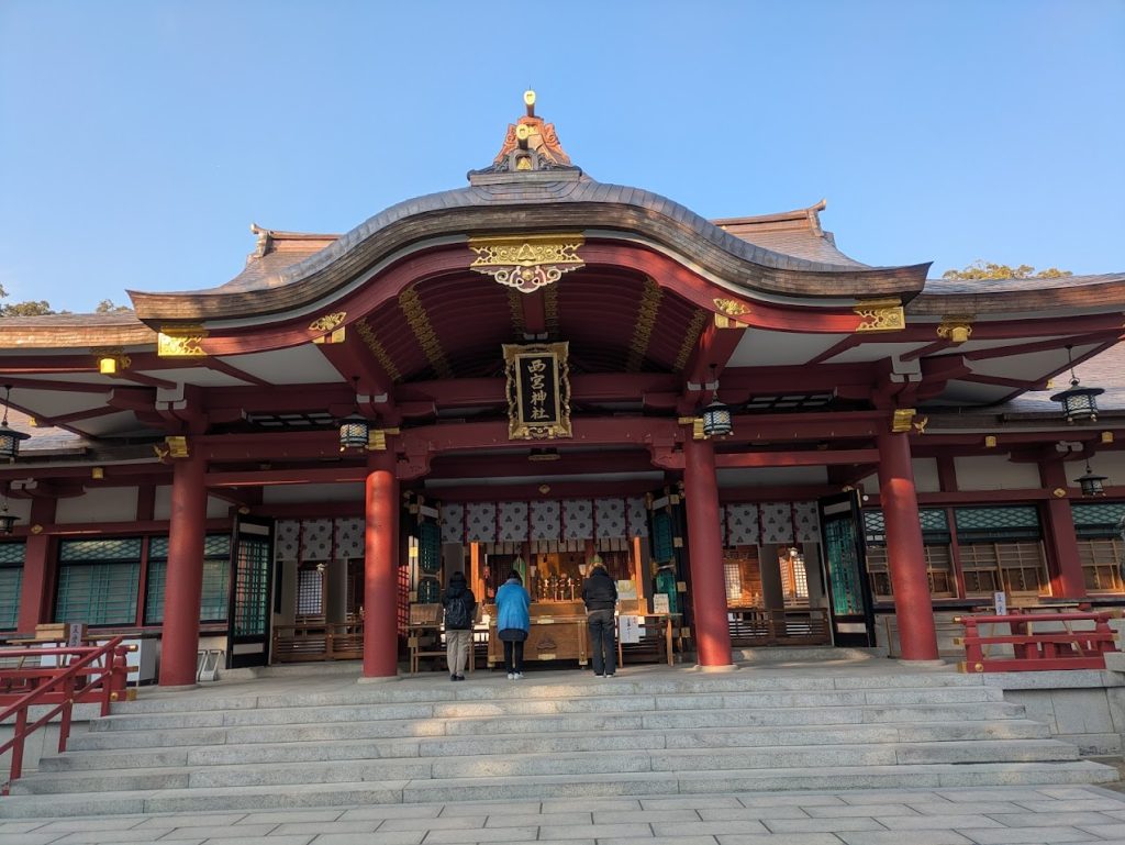 「街道」をさらに進むと「西宮神社」の「表大門(赤門)」に突き当たる。