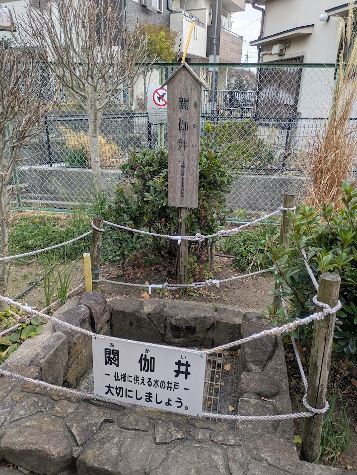 歩道橋まで戻り、国道を横断して「西国街道歩き」を再開。街道の右側に「閼伽井(あかい)」。これは仏前に供える「閼伽の水」をくみ取るための井戸である。もともとは「昆陽寺」に付属する井戸だろう。「閼伽(あか)」とは『日本国語大辞典』に 「サンスクリット語 argha、arghya 『価値』の意で、敬意を表わす贈り物のこと。功徳水と訳す」とあり、同じ音のラテン語の aqua (水)とは全く意味が違う。
