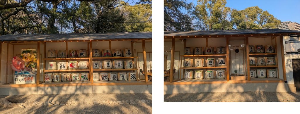 「飾樽舎」には「灘五郷」を中心に全国の酒造会社より奉納された酒樽が並んでいる。さすが、お酒の町「西宮」だ!