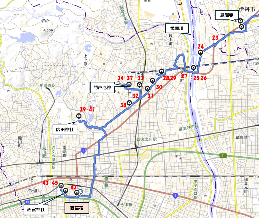 図3 昆陽宿~西宮宿行程(赤数字は写真番号)