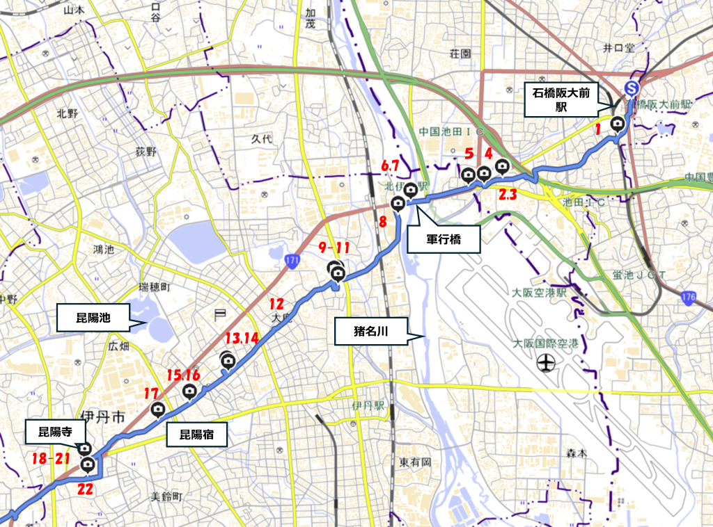 図1 石橋阪大前~昆陽宿(赤数字は写真番号)